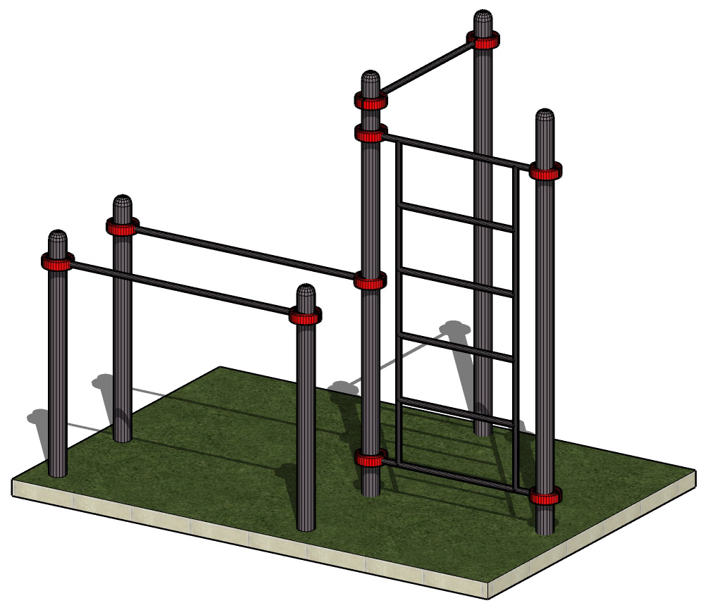 К опорным столбам высотой 2600мм в количестве 3 единиц крепится на высоте от уровня основания: 2450 мм – перекладина турника, 2300 мм- шведская стенка. Ширина шведской стенки составляет 1200 мм. Высота шведской стенки 2070 мм. Два столба высотой 1500 мм от уровня основания составляют опору для фиксации горизонтальных перекладин брусьев. Все составляющие комплекса крепятся между собой при помощи хомутов. Общая длина комплекса составляет не более 2950 м.